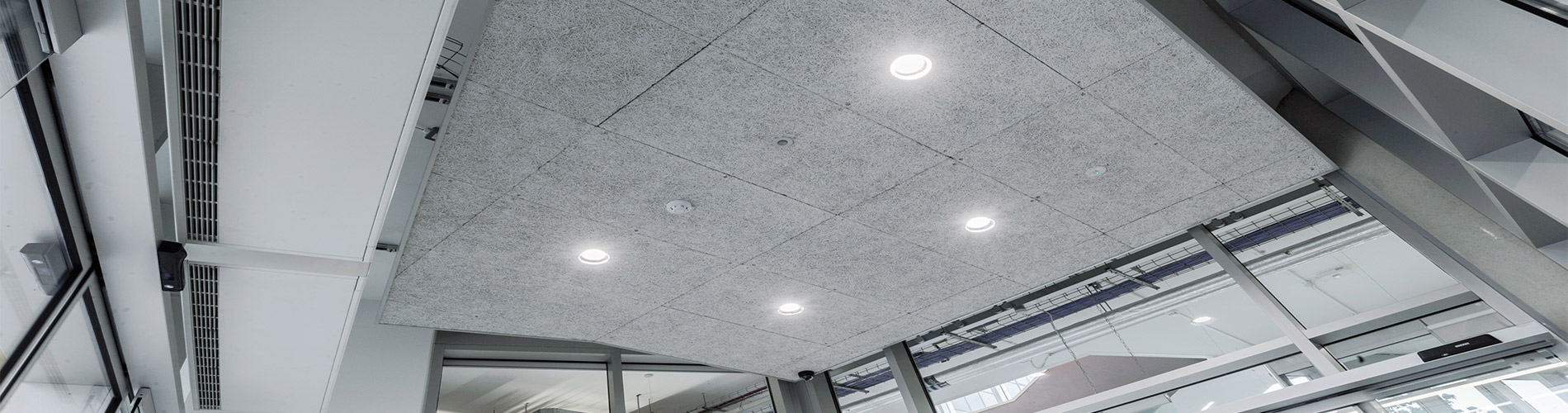 This new creative and cultural facility, known as the Eldon building, was designed by architects Penoyre & Prasad. The entrance foyer, also used as an exhibition space, displays a very dramatic ceiling using Troldtekt acoustic panels. It is a very good example of how a sustainable acoustic ceiling can be used to perform several roles simultaneously.