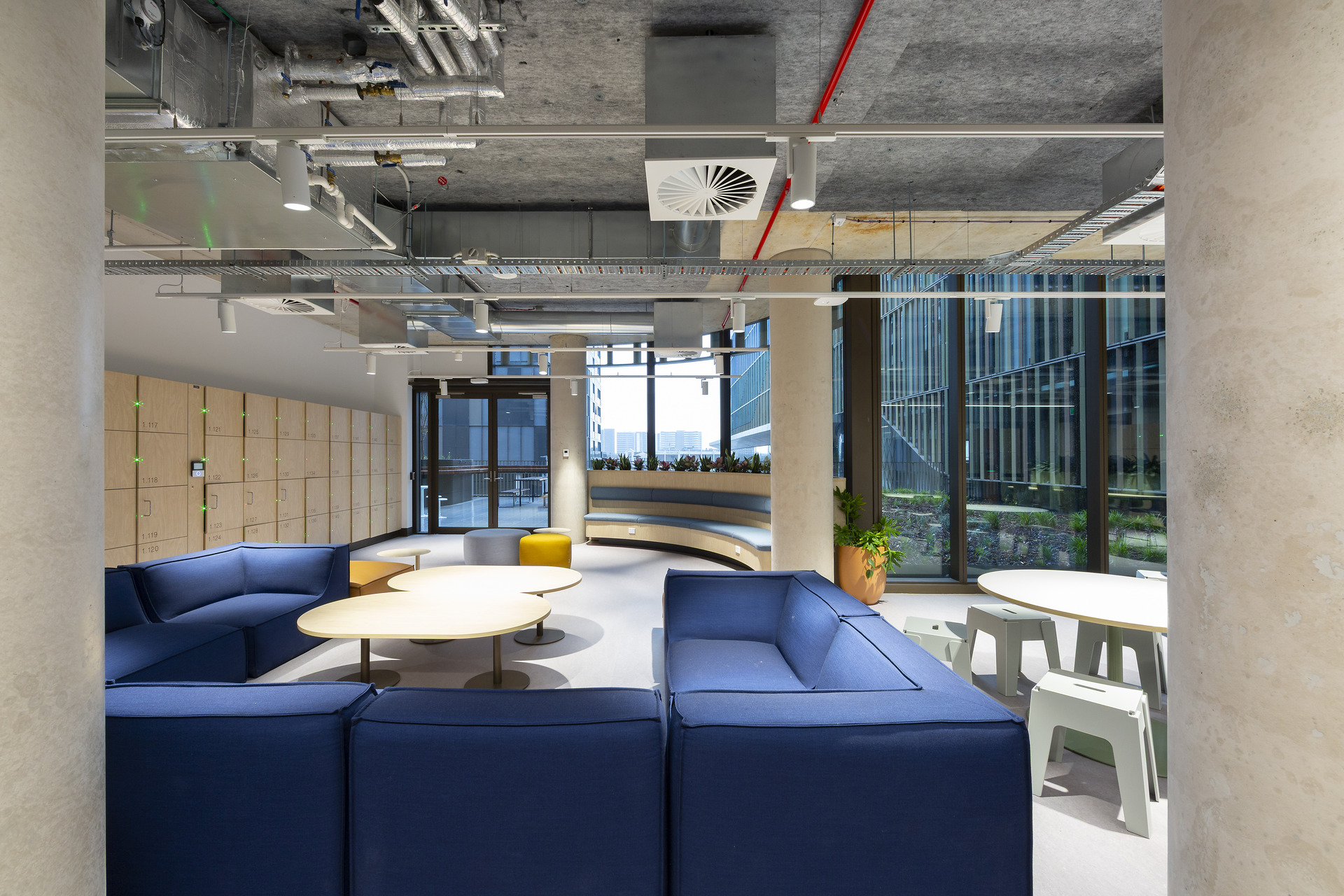 Visually, the Troldtekt panels contribute to the warm, organic feel of the interior. Their textured surface and timber-based appearance blend well with the building’s colour gradation from earthy tones at ground level to sky-inspired shades as it rises. They complement the natural light entering from above and reinforce the design concept of moving from earth to sky. This understated visual connection helps the space feel grounded in its surroundings while maintaining a clean, contemporary character.