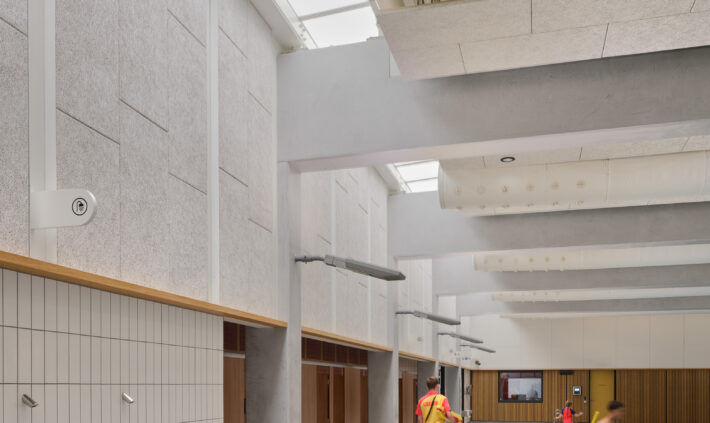 To bring this ambitious vision to life, the project team conceived a comprehensive sustainable design strategy that integrated solutions across a range of categories, including all-electric operation powered by a 240KVA solar array, a commitment to biodiversity and an exemplary approach to thermal insulation. From an indoor environment quality perspective, ensuring acoustic comfort became essential, and, as part of a broader acoustic design, the project team specified Himmel’s signature Troldtekt® White Ultrafine, whose acoustic performance contributed to achieving the desired Green Star 6-star rating.