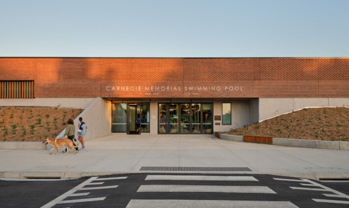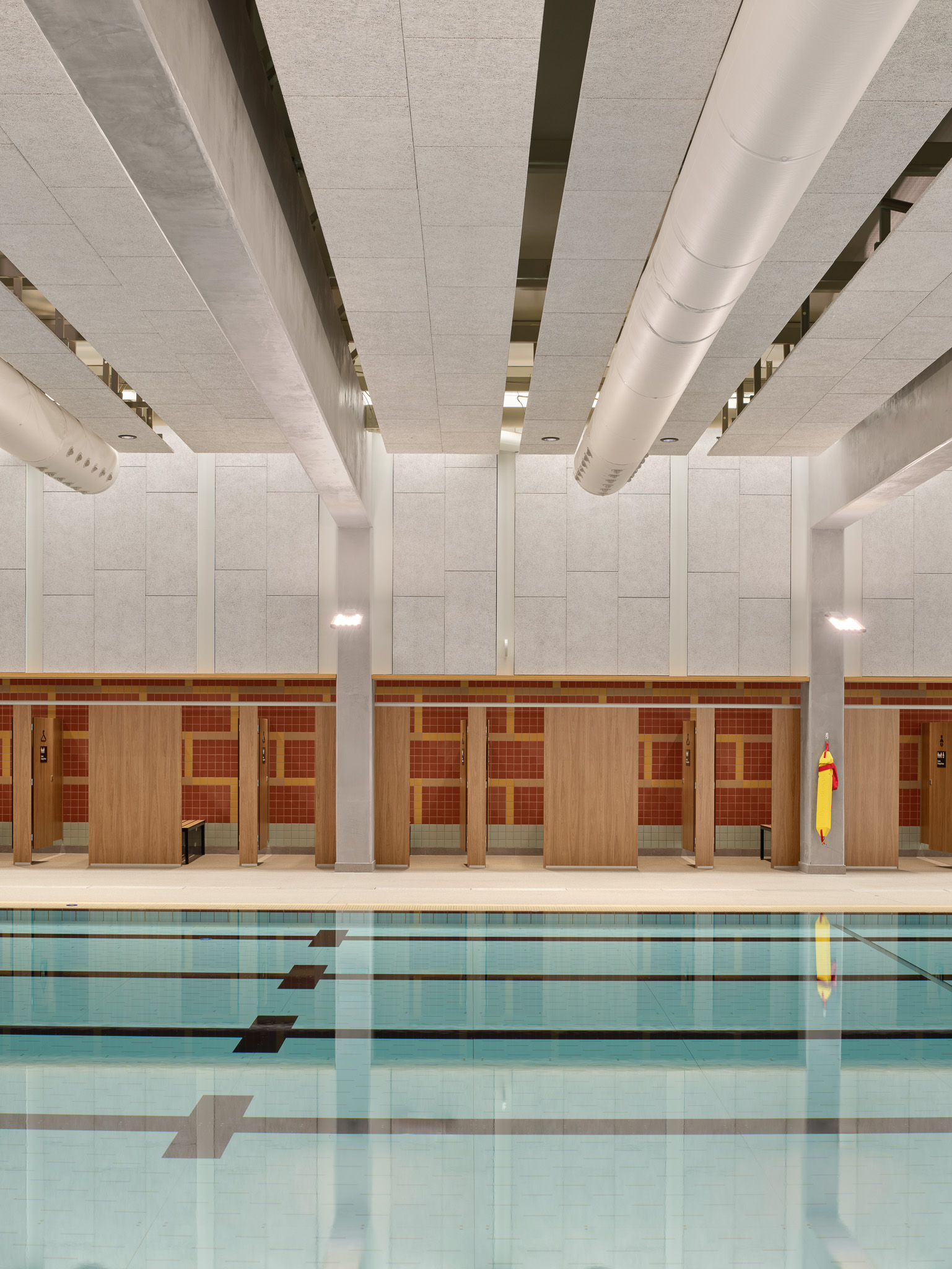 In response, this respectful design by CO.OP Studio preserves the structure’s historic heritage and emotional resonance while introducing modern amenities designed to foster its beloved community for generations to come. Deliberately juxtaposing the harsh vernacular of large, protruding and impersonal leisure centres, the expanded structure, housing indoor pools, a spa, a café and program rooms, is strategically buried into the landscape. Densely planted mounds soften the transition between the building and the surrounding park, allowing the detailed red-brick mass to gently emerge from its context like an intimate retreat.