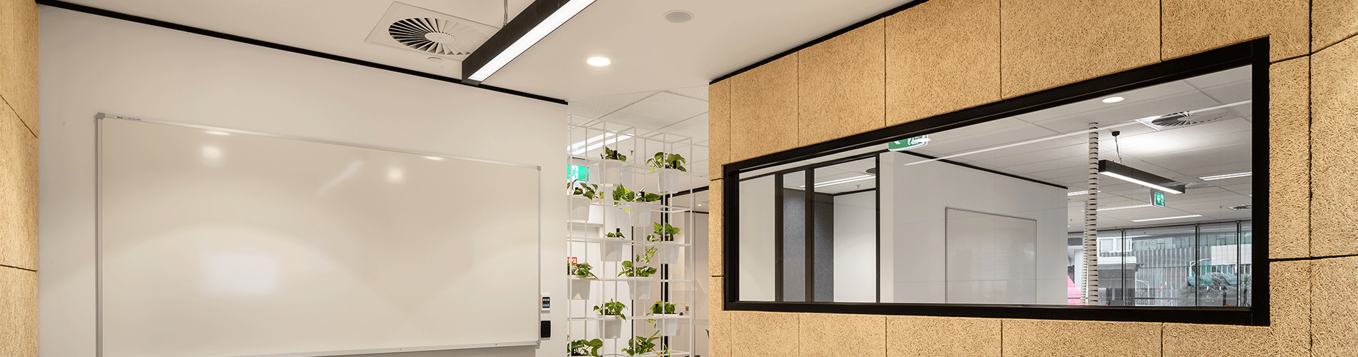 Troldtekt Ultrafine Natural cut into 600 x 600mm panels with a 5mm bevel were installed using a 10mm express joint to provide the ultimate design feature to this confidential office space. The Danish acoustic product is 100% recyclable and is manufactured using natural products that create a practical yet eye catching finish.