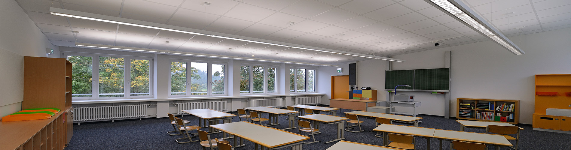 The Tafertingen Primary School in Germany features both OWA Sinfonia and OWA Aqua Cosmos Mineral Fibre Ceiling tiles. These tiles provide a modern, clean face pattern and a durable finish. Both tiles offer premium acoustic qualities and are ideal for large education spaces.