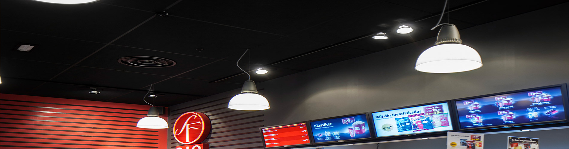 Ecophon Sombra A is a black glasswool ceiling tile that provides high sound absorption properties. It is ideal for commercial applications such as movie theatres or lecture theatres.